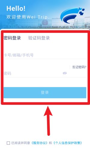 1、打开app,首次进入Wei Trip平台请先在登录界面输入账号和密码,点击蓝色按钮完成登录操作。