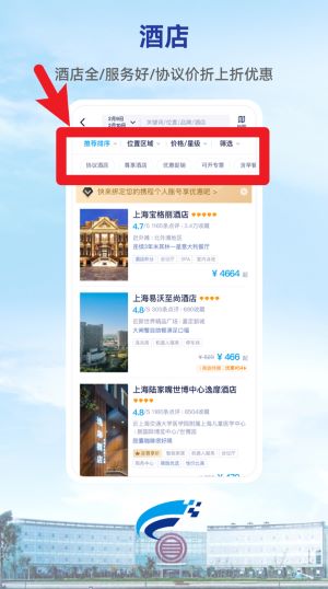 2、提供全国范围内的星级酒店预订功能,可筛选地理位置、价格与评分等条件。