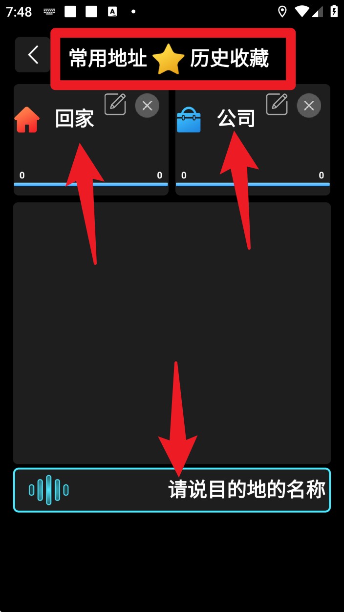 2. 点击“导航”后进入常用地址管理页面,支持语音输入目的地或选择“回家”“公司”等常驻地点。