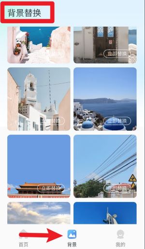 3、点击底部“背景”栏目可进入背景替换页面,自由选择喜欢的图片进行“立即替换”。