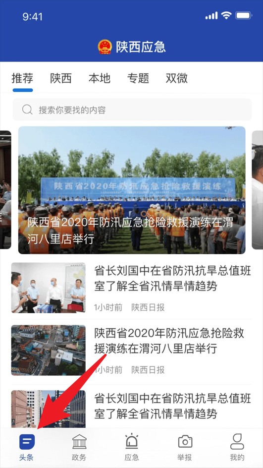 1、打开App后預設进入“头条”页面,展示本地应急资讯与突发事件动态,可点击查看图文详情内容。