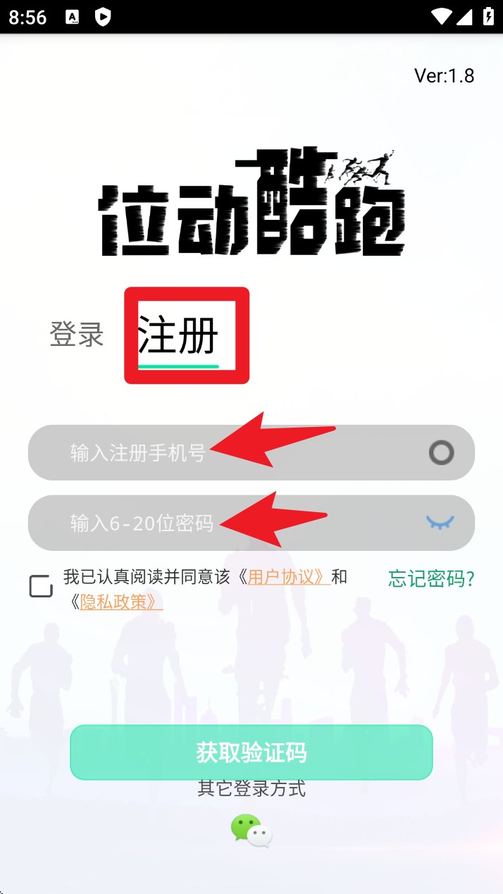 1. 打开 App 后,选择注册或登录,填写手机号与密码,即可进入位动酷跑首页开启使用流程。