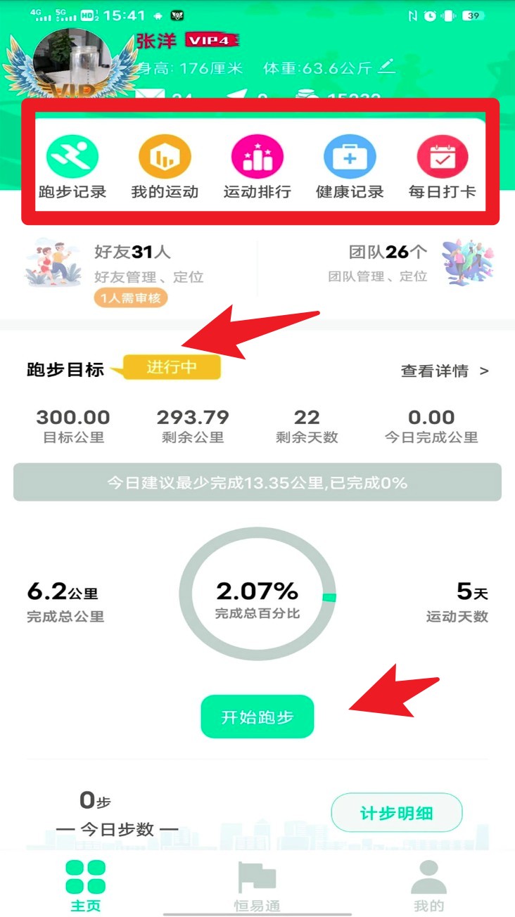 4. 每次完成运动后系统会生成对应记录,回到主页面可查看总公里数、完成率与剩余天数等数据统计。