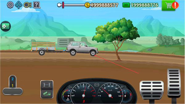 2、操控卡车在土道路行驶,通过油门刹车控速,避开路边树木保持稳定。