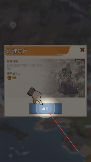 1、接取清理丧尸任务,消耗100战力点击战斗进入关卡。