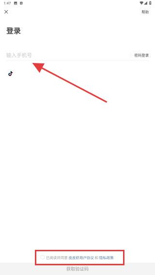 2、在登录界面,输入手机号并获取验证码,勾选皮皮虾用户协议和隐私政策,再点击登录即可。