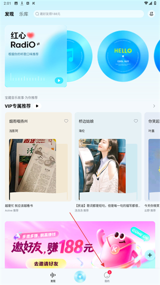 1、打开酷狗音乐app,在首页找到底部我的按钮并点击,进入我的页面。