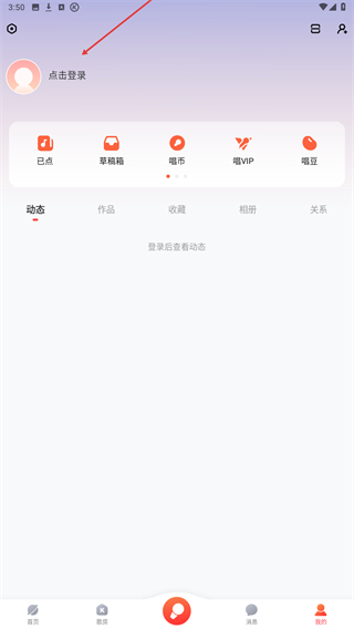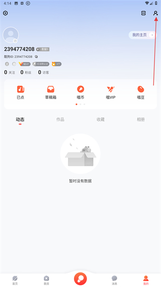 1、在酷狗唱唱页面底部导航栏,点击我的选项,进入个人中心界面。