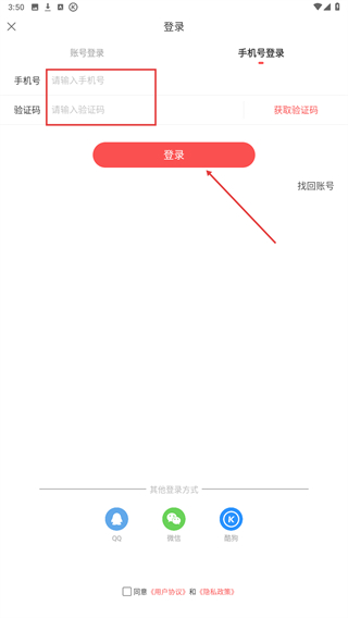 3、在登录界面中,输入手机号、验证码后,点击登录的按钮即可完成登录。