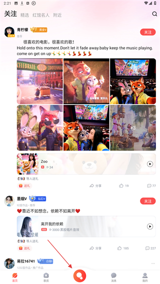 1、启动酷狗唱唱的应用,在首页下方点击麦克风的按钮。