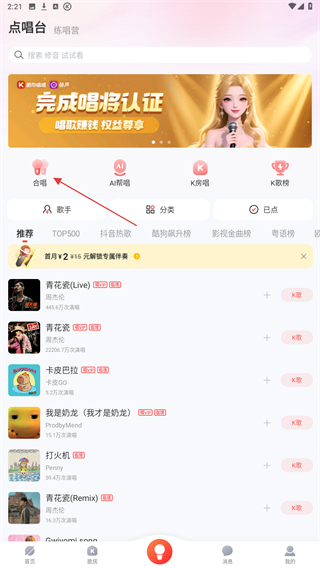 2、进入点唱台的页面内,点击合唱的功能按钮。