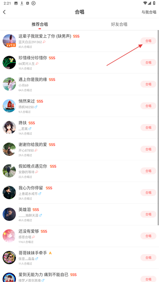 3、在合唱的页面内,选择歌曲并点击右侧合唱的按钮。