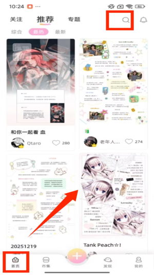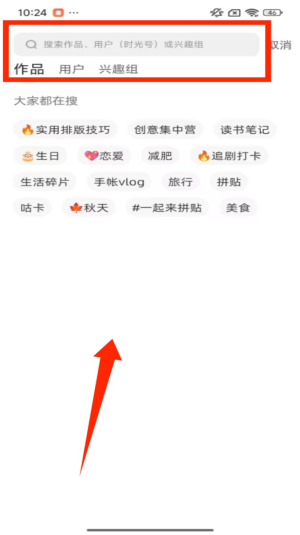 1、进入软件首页,点击顶部搜索图标,在搜索框输入内容,可查找作品、用户或兴趣组,还能看到热门搜索词条。