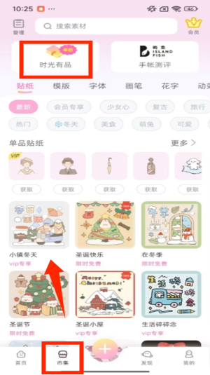 2、点击底部 “市集” 选项,进入后选择 “时光有品” 板块,可看到贴纸、模板等素材分类,按需选取可用的手帐素材。