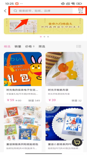 3、在市集页面的搜索框输入胶带、贴纸等关键词,能查找对应的商品,还可通过销量、价格筛选想要的物品。