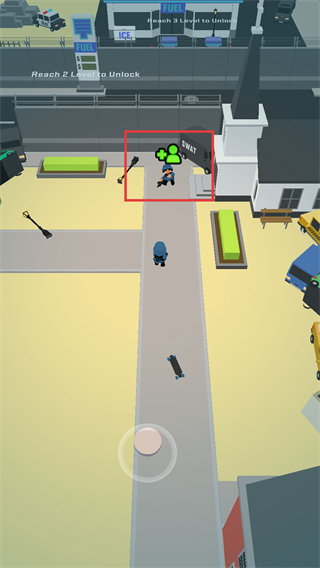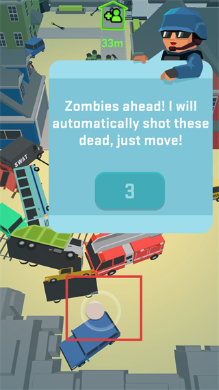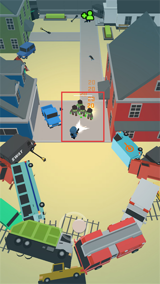 2、靠近僵尸群后,角色会自动射击消灭僵尸,收集僵尸掉落的数值道具,推进关卡进程。