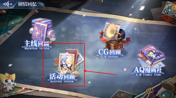 3、在【剧情回忆】页面点【活动回顾】入口,查看往期活动完整剧情,参与回顾玩法得专属道具与成就。