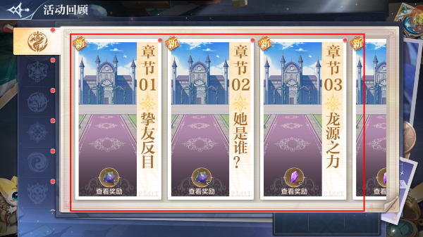 4、进入【活动回顾】选对应章节如【章节01-挚友反目】,完成剧情后点【查看奖励】领取专属道具。