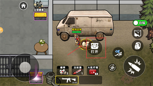 2、进入战场后靠近物资区域,点击【打开】拾取道具,同时留意周围环境避免敌人突袭。