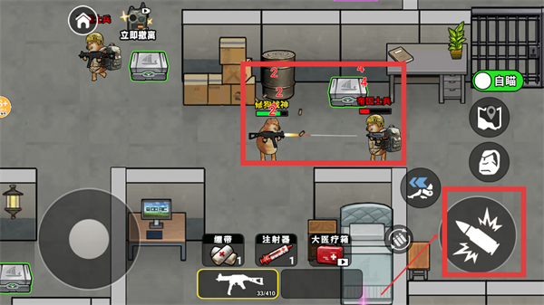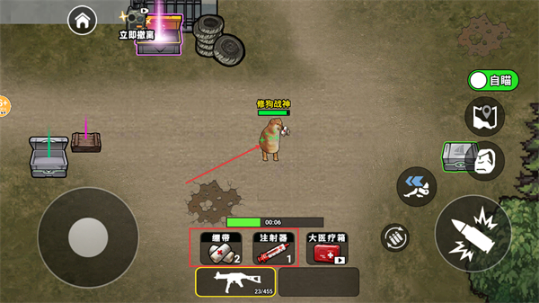 3、遇敌时开启【自瞄】功能,用【武器】瞄准射击,借助掩体调整站位提升战斗优势。