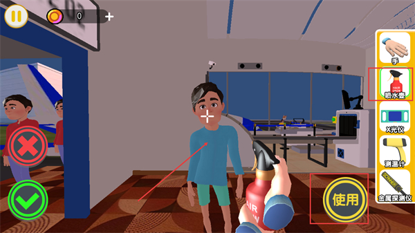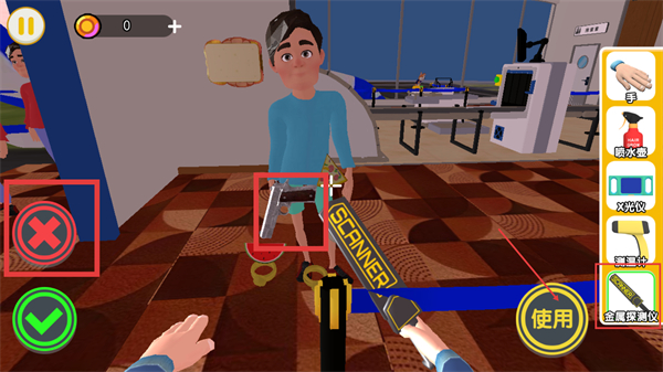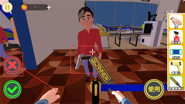 3、切换至【金属探测仪】道具并点击【使用】,可检测人员携带的金属违禁物品(如枪支)不允许入场。