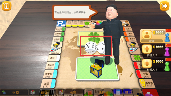1、观察购物回合提示,点击骰子投掷,根据点数移动角色,推进游戏流程,触发对应地块事件。