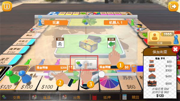 2、地产拍卖系统增加了策略维度,当你放弃购买土地时,所有玩家可以参与竞拍,往往能以更低价格入手。