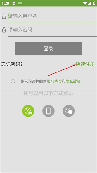3、在登录页面,点击快速注册选项,即可进入注册页面。