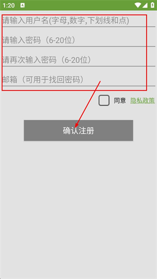 4、在注册页面,填写用户名、密码、确认密码、邮箱后,点击确认注册。
