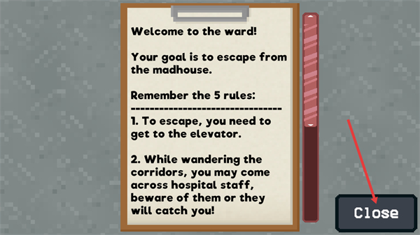 2、阅读纸张里的5条规则,了解需前往电梯逃脱、躲避医护人员,看完后点击【Close】关闭界面继续探索。