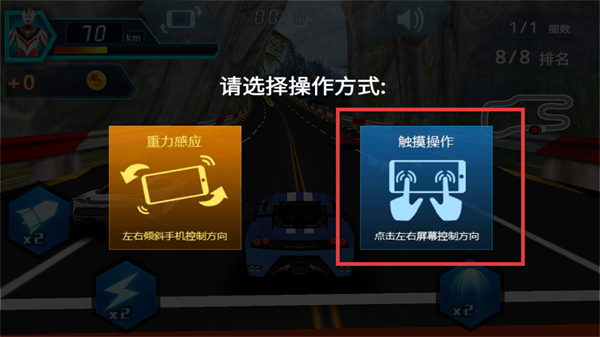 1、在操作选择点击左右屏幕控制车辆方向,开启赛车关卡的操作流程。
