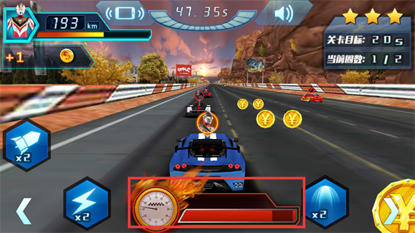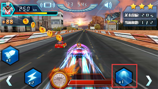 4、使用技能道具增强行驶能力,持续保持高速前进,完成当前圈数的赛程,向关卡目标推进。