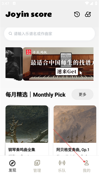 1、进入【乐其爱乐谱】后,可通过顶部搜索框输入乐谱名或作曲家找谱,点击底部【我的】可进入个人页面。