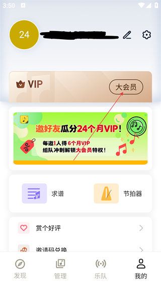 2、在个人页面点击【大会员】按钮,可进入大会员详情页面,该页面有邀好友瓜分VIP活动及【求谱】【节拍器】功能入口。