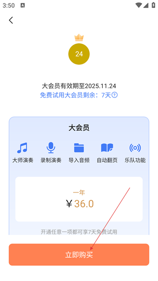 3、在大会员页面,若需开通可点击【立即购买】,一年费用¥36.0,开通后可享大师演奏、录制演奏等特权。