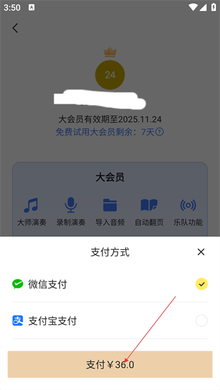 4、购买大会员时,可选择【微信支付】或【支付宝支付】方式,确认支付方式后点击【支付¥36.0】即可完成购买。