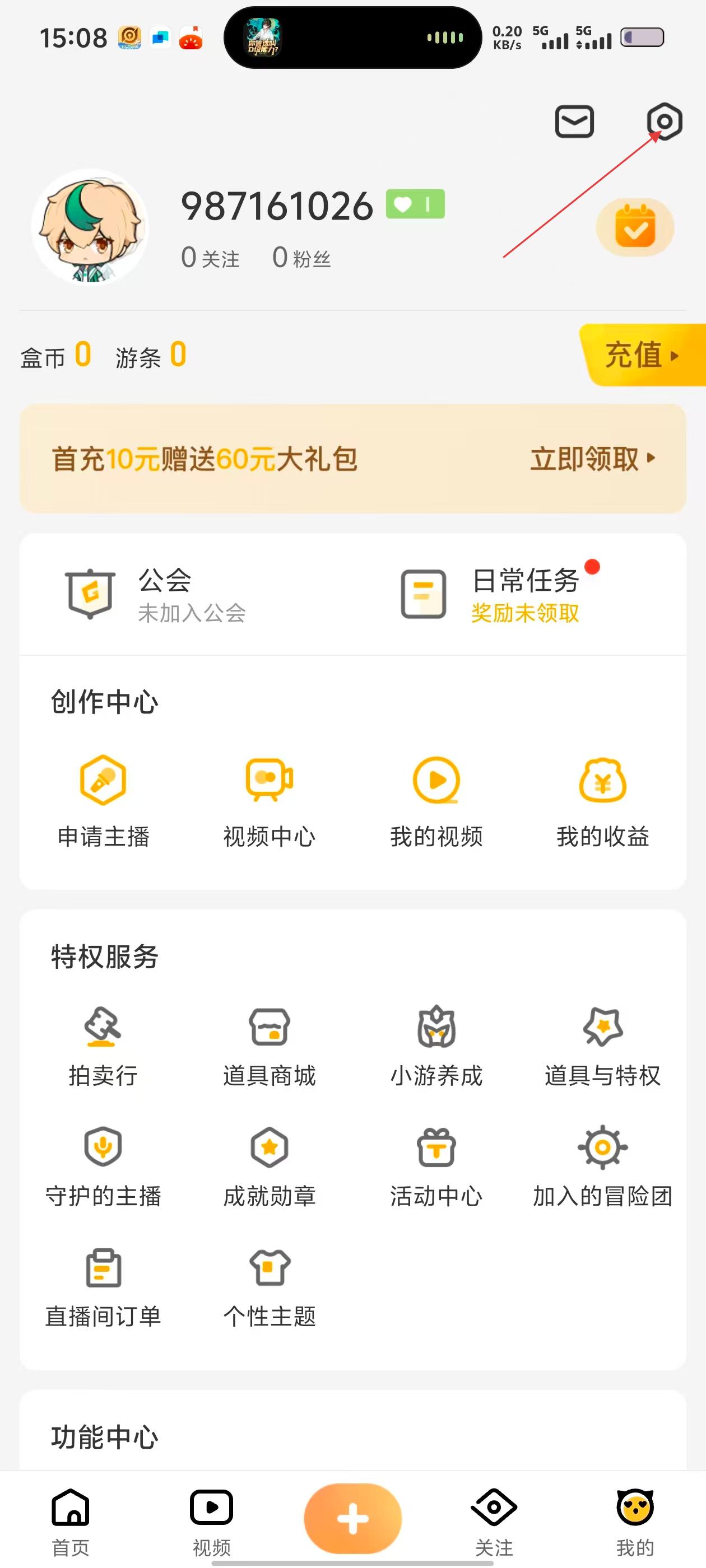 2、进入【我的】页面,能看到账号等信息,还有创作中心、特权服务等板块,点击右上角设置图标可进入设置页。