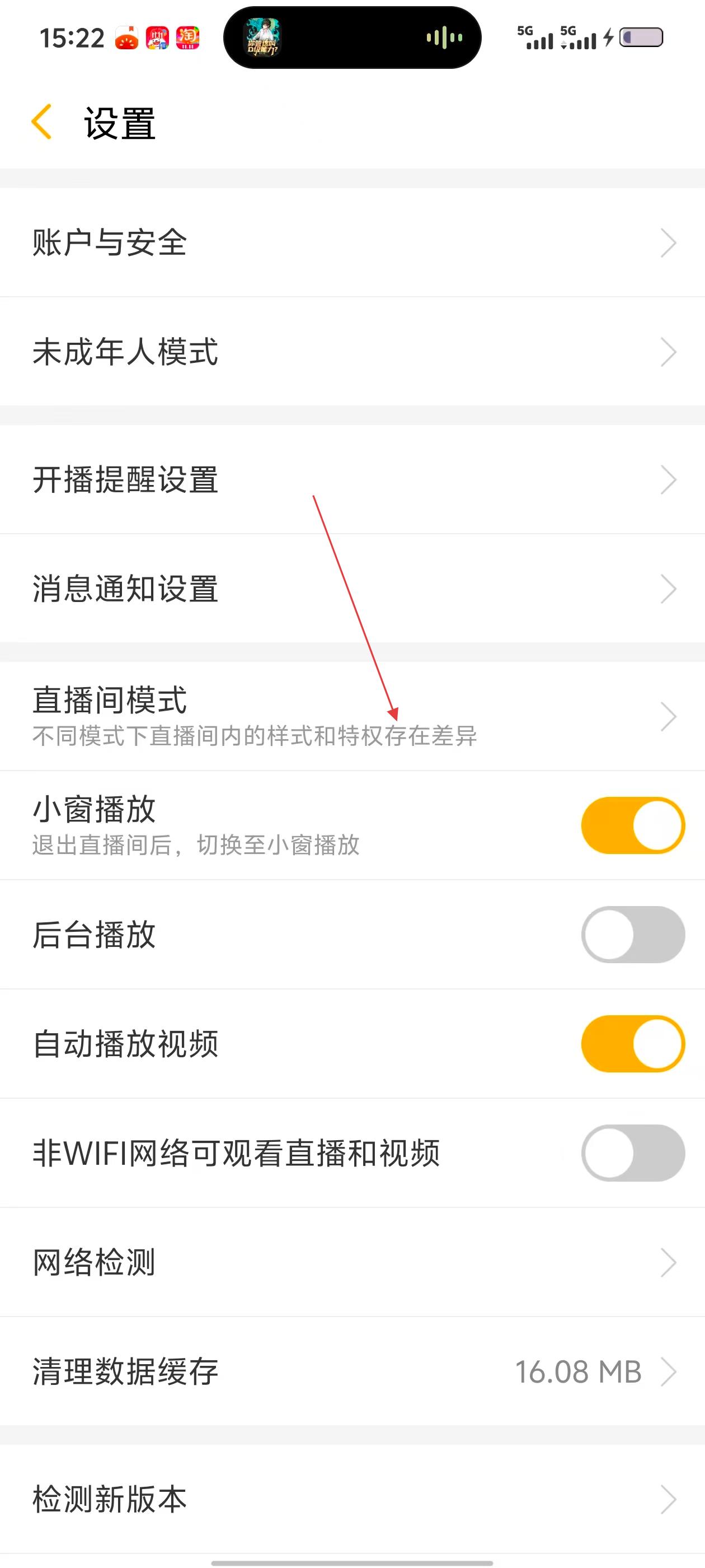 3、在设置页,有【账户与安全】等选项,还有小窗播放等功能开关,点击【直播间模式】可进入相关设置页。
