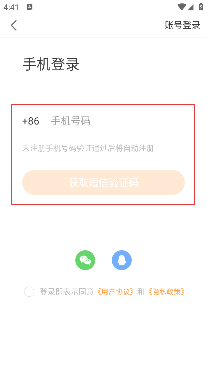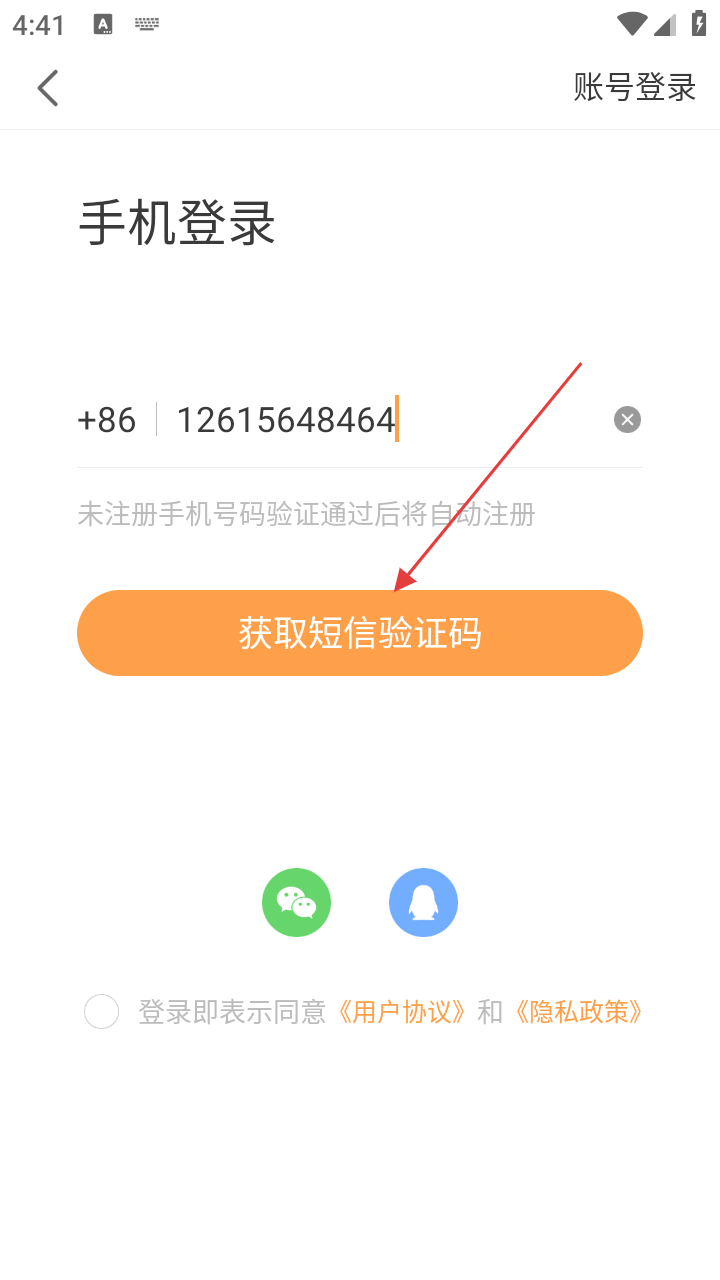 4、输入手机号,点击【获取短信验证码】,接收并填入验证码完成登录/注册。