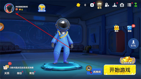 1、在彩虹朋友太空的游戏主界面,点击左上角的个人头像,进入个人主页页面。