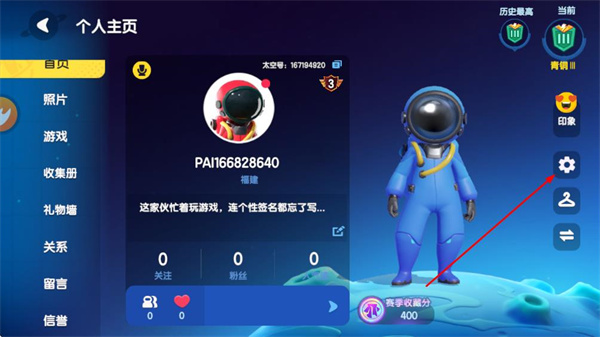 2、在个人主页页面,点击右侧的设置图标,展开功能操作菜单。