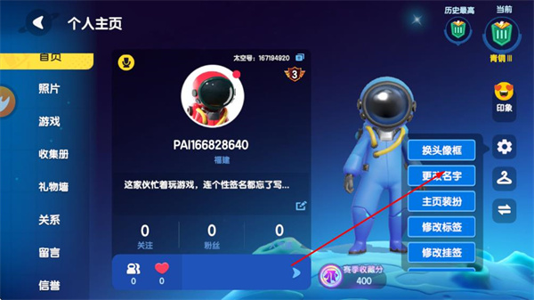 支持更换头像框、修改昵称、搭配主页装扮等操作,玩家可打造专属个人标识,从昵称到形象都能体现个性,增强游戏的身份代入感。