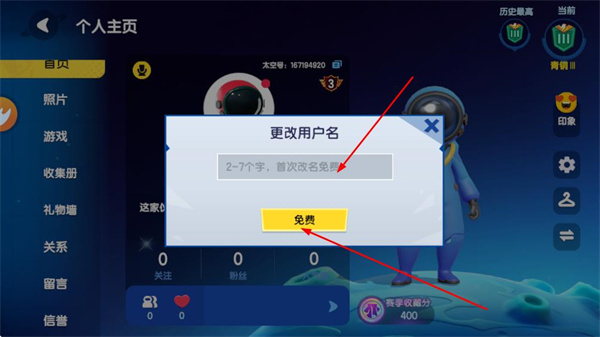 4、在更改用户名弹窗的输入框中填写新名字,点击免费完成名字修改。