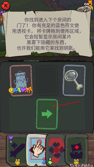 2、找到下房间的门后,消耗蓝色符文将【透视卡】拖到使用区域,短暂显示房间黑雾下隐藏的物品以寻找钥匙。