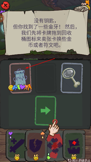 2、卡牌系统包含使用与回收机制,除了使用卡牌发挥效果,还可以将不需要的卡牌拖入回收桶换取资源,但需承受轻微伤害。