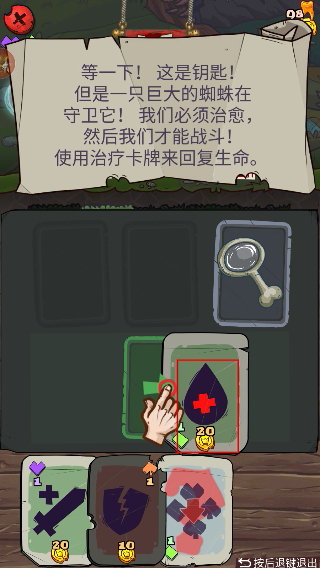 4、发现钥匙但遇巨蛛守卫时,先使用【治疗卡牌】回复生命值,再准备战斗以获取钥匙。