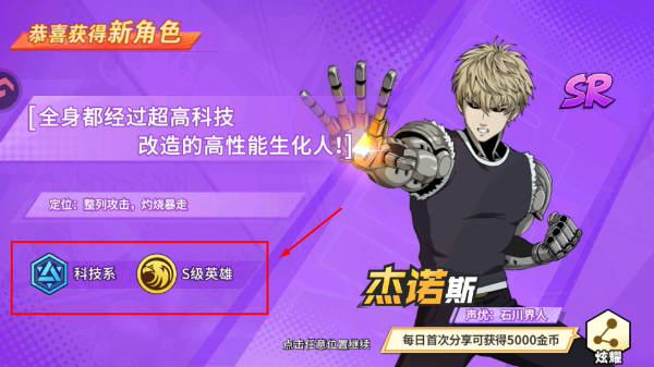 3、获得新角色【杰诺斯】,定位整列攻击对侵暴徒,属性为【科技系】-【S级英雄】,增强队伍输出。