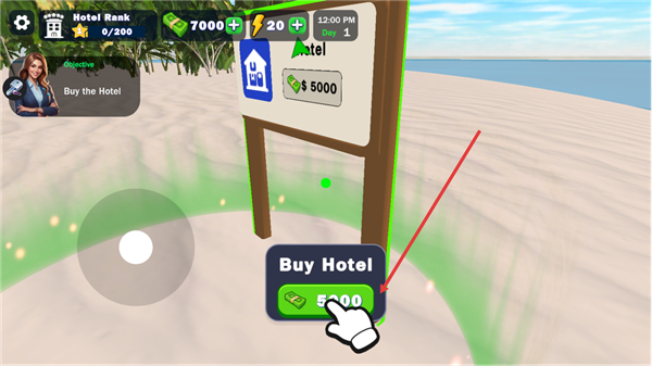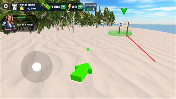 1、在沙滩场景中,跟随视觉指引,操控角色移动至酒店标识所在位置,明确初始经营目标为购入该酒店,开启后续的经营流程。