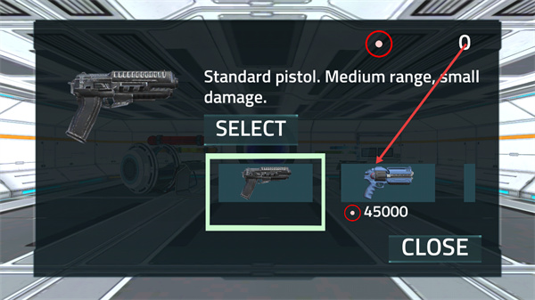 4、在武器界面中,可选择购买不同武器,当前点击SELECT选中手枪,该武器为中距离低伤害类型。