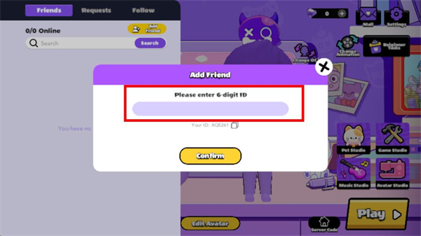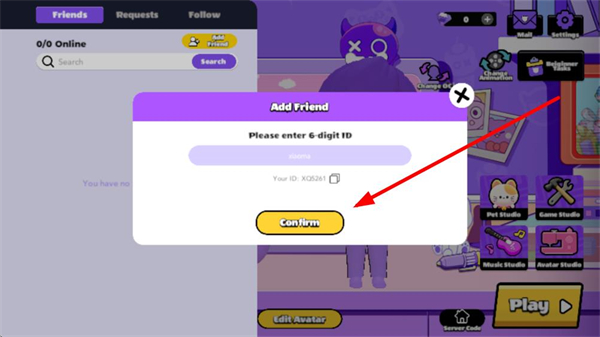 4、输入好友ID后,点击弹窗中的Confirm按钮,即可发送好友请求,完成添加好友的操作流程。